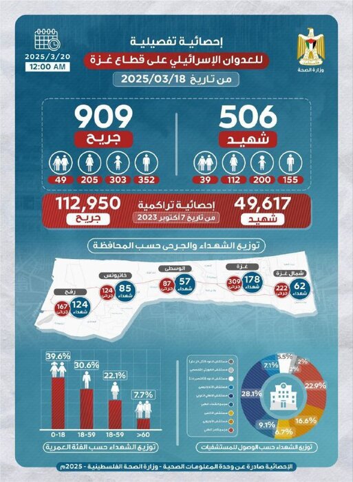 براساس اعلام این وزارتخانه، از آغاز حملات دشمن صهیونیست به نوار غزه از بامداد سه شنبه تا این لحظه ۵۰۶ فلسطینی به شهادت رسیده و ۹۰۹ نفر نیز زخمی شدهاند.
