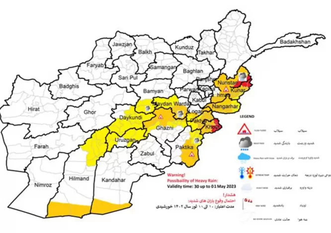 ریاست هواشناسی تحت مدیریت طالبان روز یکشنبه، ۱۰ ثور، با نشر خبرنامهای گفته است که احتمال بارندهگی نسبتاً شدید و سرازیر شدن سیلاب در ولایتهای لغمان، نورستان، کنر، ننگرهار، لوگر، پکتیا، خوست، غزنی، میدان وردک، دایکندی، بامیان، کندهار، ارزگان و هلمند وجود دارد.
