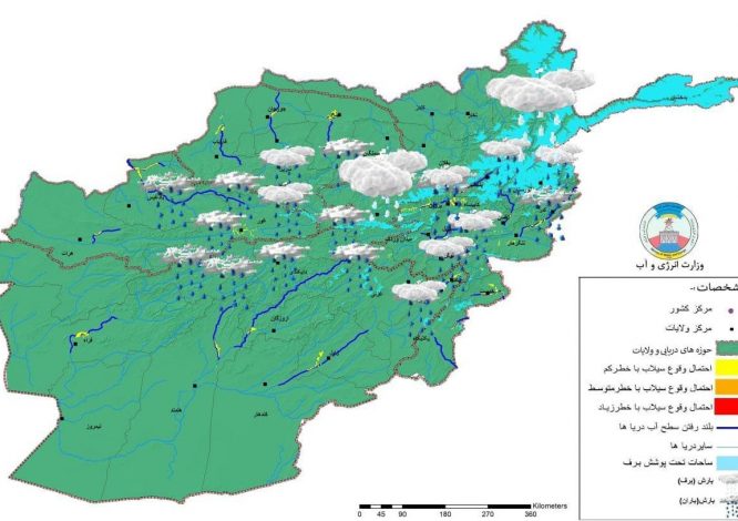 بربنیاد خبرنامه‌ ای این وزارت احتمال ریزش باران و برف نسبتاً شدید همراه با سیلاب‌های آنی در حوزه دریایی “شمال، هریرود، هلمند و کابل”و احتمال وقوع سیلاب ناشی از بارندگی، آب شدن برف با بلند شدن سطح آب در مسیر دریاهای سمنگان، بلخ، جوزجان، فاریاب، بادغیس، غور، هرات، فراه، ارزگان، زابل پکتیکا، پکتیا، خوست، کابل، پنجشیر، غوربند کنر، لغمان، و غزنی پیش بینی شده است.
