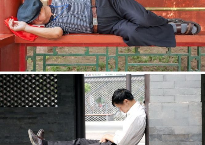 در چین بیشتر مردم ساعت‌های طولانی کار می‌کنند و گاهی هیچ تعطیلی ندارند. به همین خاطر قابل درک است که در طول روز هر جا که شود چرت می‌زنند. فرقی نمی‌کند آنجا محل کارشان، در قطار یا حتی روی نیمکتی در خیابان باشد، آن‌ها هرگز برای اینکه چند دقیقه‌ای چشمان شان را روی هم بگذارند درنگ نمی‌کنند. رهگذر‌ها هم خوب می‌دانند که نباید مزاحم آن‌ها شوند.