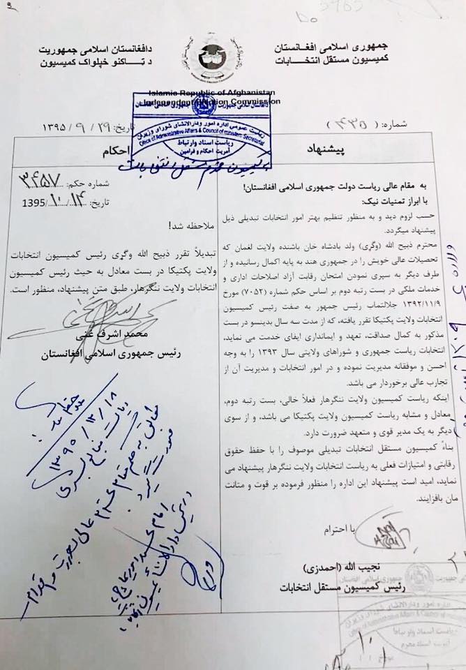 در مکتوب جدید به امضای آقای نجیب الله احمدزی رییس کمیسیون مستقل انتخابات، ذبیح الله وگری رییس پیشین کمیسون انتخابات ولایت پکتیکا را بحیث رییس کمیسون انتخابات ولایت ننگرهار به رئیس جمهور پیشنهاد شده است.