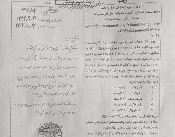 وزارت تحصیلات عالی طالبان در یک نامه رسمی نوشته که قرار است در هر زون افغانستان، مدرسههای تخصصی دینی تاسیس کند.