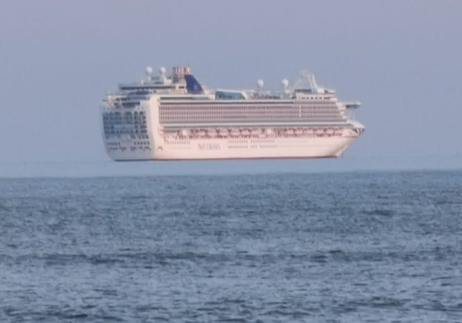در تصویری که از یک کشتی تفریحی غول پیکر در سواحل کورن‌وال گرفته شده، این کشتی از جاذبه سرباز زده و روی آب‌ها در هوا معلق مانده است.