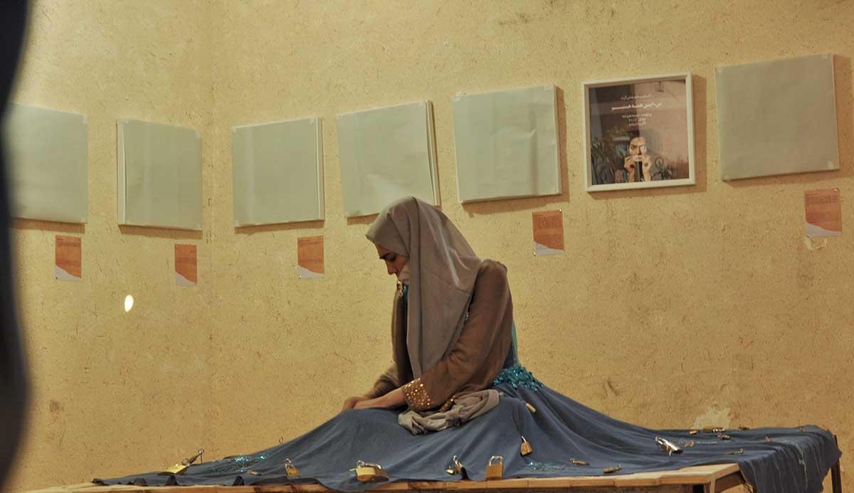 به گزارش خبرگزاری اطلس، در این اجرا، پرفورمر(خانم حبیبه علیزاده) با لباسی ابداعی و دامنی گسترده بر سطحی چوبی نشسته و دامن او تمام سطح چوبی را پوشانده و قفلهای کوچک و بزرگ دامن آرتیست را به زمین دوخته است.