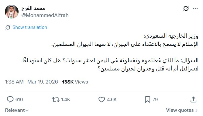 محمد الفرح، عضو دفتر سیاسی جنبش انصارالله یمن، از عربستان سعودی و امارات متحده عربی خواست برای جلوگیری از گسترش جنگ، پایگاههای نظامی ایالات متحده را در قلمرو خود مسدود کنند. او تأکید کرد که به باور انصارالله، حضور این نیروها نهتنها امنیت ایجاد نمیکند، بلکه خطر درگیری را افزایش میدهد.