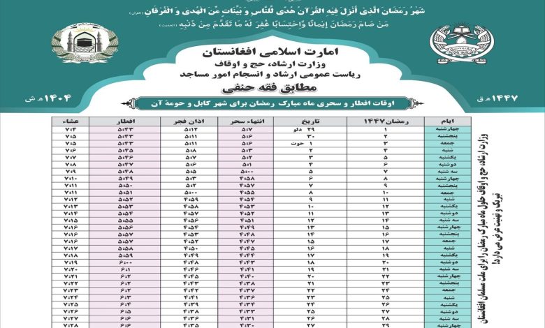أعلنت وزارة الحج والأوقاف مواعيد الإفطار والسحور لشهر رمضان المبارك في مدينة كابل والمناطق المحيطة بها، وحددت يوم الأربعاء، 29 من شهر دلو، كأول يوم في الشهر الفضيل. وقد تم إعداد هذه المواعيد وفقاً للفقه الحنفي.