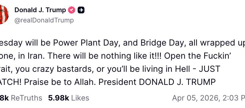 دونالد ترامب، رئيس الولايات المتحدة الأمريكية، حذر في رسالة نشرها على شبكة التواصل الاجتماعي “تروث سوشيال” من أنه إذا لم يُفتح مضيق هرمز، فسيتم استهداف منشآت توليد الطاقة والجسور في إيران يوم الثلاثاء. جاء هذا التحذير ردًا على إغلاق هذا الممر الاستراتيجي من قبل الحرس الثوري الإيراني.