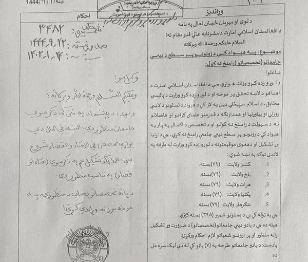 وزارت تحصیلات عالی طالبان در یک نامه رسمی نوشته که قرار است در هر زون افغانستان، مدرسههای تخصصی دینی تاسیس کند.