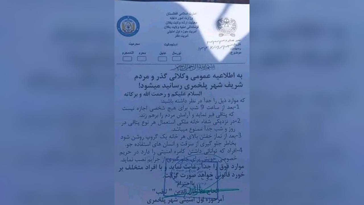 اداره طالبان در بغلان بهدلیل افزایش جرایم، از باشندهگان خواست شبها گروپ روشن و کمره امنیتی نصب کنند.