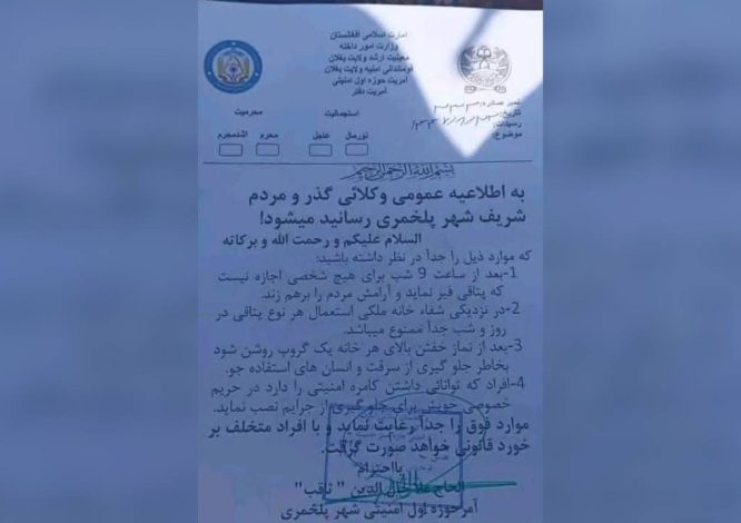 قومندانی امنیه اداره طالبان در ولایت بغلان با نشر مکتوبی رسمی از باشندهگان این ولایت خواسته است برای جلوگیری از افزایش جرایم جنایی، شبها دروازهها و سردر خانههایشان را با نصب گروپ روشن نگه دارند. در این مکتوب که روز پنجشنبه، ۲۳ دلو منتشر شده، تأکید شده است پس از نماز خفتن باید بالای هر خانه چراغ روشن باشد تا از سرقت و «افراد استفادهجو» جلوگیری شود.