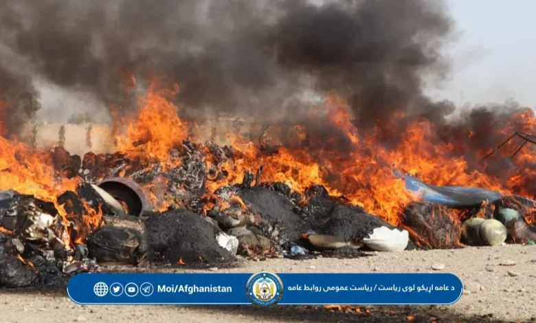 The Taliban’s Ministry of Interior has announced the incineration of 12,272 kilograms of confiscated narcotics in Helmand province, carried out in the presence of an official delegation. According to the ministry, the drugs had been collected earlier this year (1404 Hijri Solar calendar) by the counter-narcotics police from various districts and the provincial center.