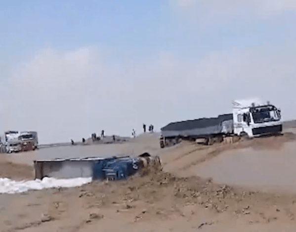 According to images circulated on social media yesterday, a truck overturned on the Herat-Kandahar highway, in the Dasht-e Bakwa area, due to flash flooding caused by heavy rains.