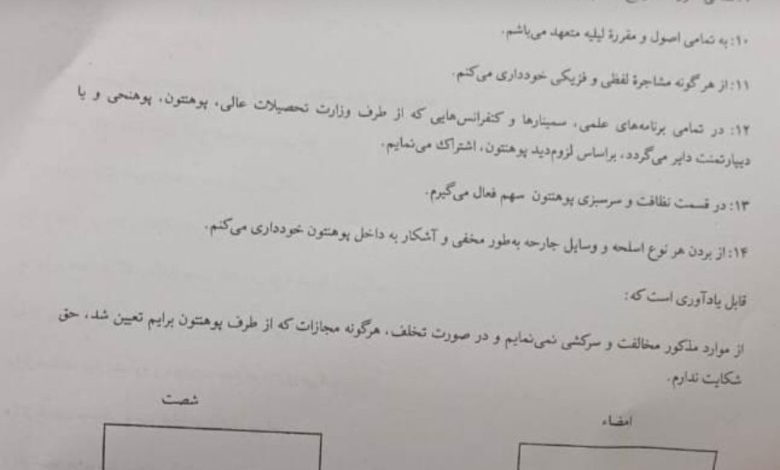Kabul University, operating under Taliban administration, has required students to sign a written pledge obliging them to adhere to the standards set by the Taliban regime regarding worship, dress code, and obedience to the commands of the “Islamic Emirate.” The document stipulates that students must perform prayers in congregation, grow beards according to what is referred to as the “Prophetic tradition,” and avoid walking around campus without wearing a hat.