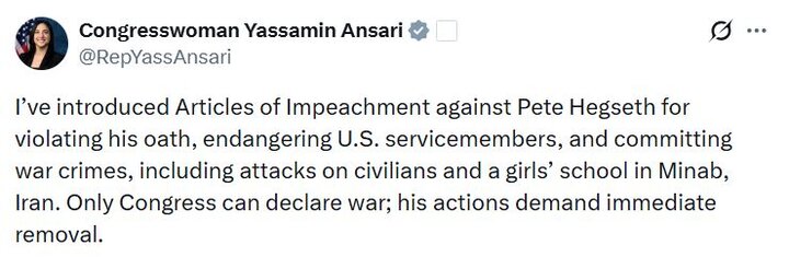یاسمین انصاری، عضو ایرانیتبار مجلس نمایندگان آمریکا، اعلام کرده است که طرح استیضاح پیت هگست، وزیر جنگ این کشور را به اتهام ارتکاب جنایت جنگی و نقض قانون اساسی ایالات متحده ارائه کرده است. به گفته او، حمله به یک مدرسه دخترانه در میناب ایران و کشته شدن بیش از ۱۶۰ کودک از موارد مطرحشده در این پرونده است.