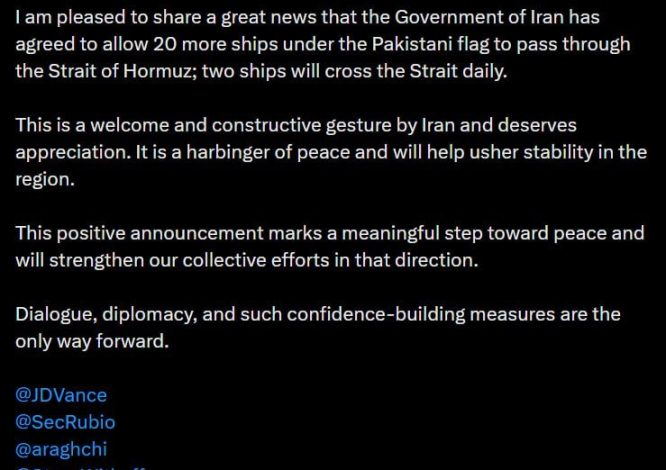 وزیر امور خارجه پاکستان اعلام کرده است که جمهوری اسلامی ایران با عبور ۲۰ فروند کشتی با پرچم پاکستان از تنگه هرمز موافقت کرده است. به گفته او، این کشتیها روزانه بهگونه میانگین دو فروند از این گذرگاه راهبردی عبور خواهند کرد.