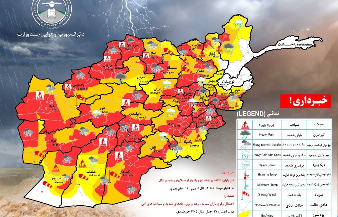 ریاست هواشناسی اداره طالبان از احتمال بارش شدید و سیلابهای آنی در ۳۳ ولایت کشور خبر داده است.