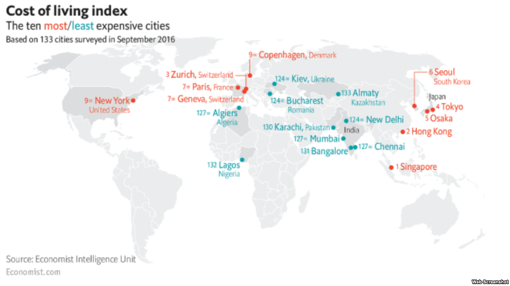 واحد اطلاعاتی نشریه اکونومیست در گزارش امسال خود با ارزیابی هزینه بیش از ۱۵۰ گونه کالا و خدمات در ۱۳۳ شهر بزرگ روی زمین، سنگاپور، هنگ کنگ و زوریخ را به ترتیب در صدر فهرست گرانترین شهرها برای زندگی یا سفر برآورد کرده است و شهر کراچی در پاکستان و بنگلور در هند به ترتیب ارزان ترین شهرها در این فهرست قرار گرفته است.