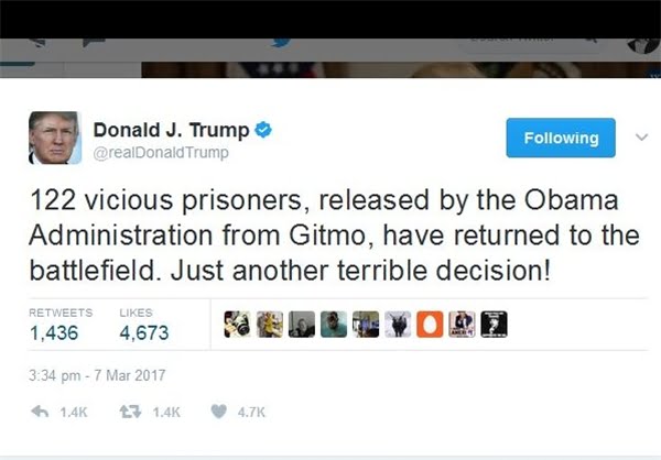 دونالد ترامپ در توئیتر خود نوشت زندانیانی که باراک اوباما از گوانتانامو آزاد کرده بود اکنون به میدان جنگ بازگشتهاند.