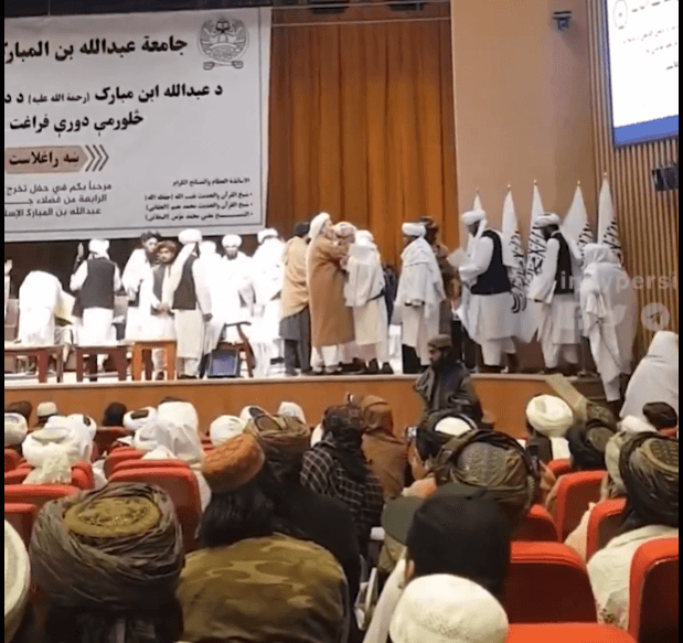 ویدیوهای منتشرشده نشان میدهد مراسم فراغت یک مدرسه دینی وابسته به اداره طالبان در سالون دانشگاه کابل برگزار شده است.