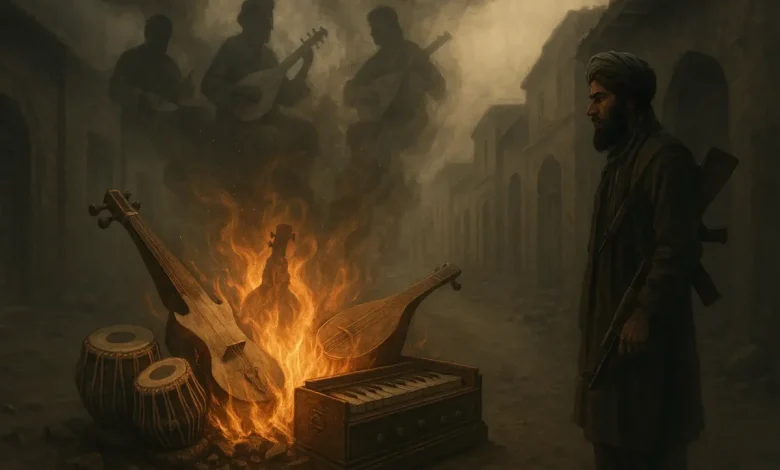 په بېلابېلو راپورونو کې راغلي چې طالبانو تر ټولو پراخ اقدام د موسیقۍ وسایلو ویجاړول دي. د طالبانو سیمهییز چارواکو ویلي چې په یوه ټاکلي موده کې یې له ګیتار، رباب، هارمونیوم او طبل څخه تر صوتي سیستمونو پورې شاوخوا ۲۱ زره موسیقي وسایل سوځولي یا مات کړي دي. په هرات کې د اور اخیستیو سازونو انځورونه خپاره شول، چې د فرهنګي ځپنې سمبول جوړ شوي دي.