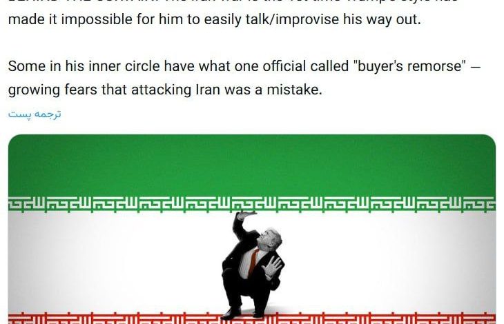 امريکايي رسنۍ آکسیوس راپور ورکړی چې يو شمېر کسان د دونالد ټرمپ، د متحده ايالاتو د ولسمشر، له نږدې کړۍ څخه د ايران پر ضد د بريد په اړه شکمن او پښېمان شوي دي. د دې رسنۍ په وينا، ځينې له دغو کسانو اوس دا باوري ګڼي چې دا اقدام ښايي يوه ناسمه پرېکړه وه.