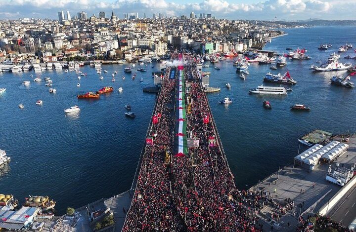 د نوې میلادي کال په لومړۍ ورځ، د ترکیې د استانبول ښار زرګونه اوسېدونکي د غزې له جګړه‌ځپلو او محاصره شوو خلکو سره د همبستګۍ د څرګندولو لپاره په یو پراخ لاریون کې ګډون وکړ. دغه ستره غونډه د چهارشنبې سهار وختي د استانبول په ګالاتا پُل کې پیل شوه، چیرې چې شاوخوا ۴۰۰ مدني بنسټونو او ټولنیزو سازمانونو د دې لاریون په تنظیم کې ونډه لرله. ګډونوالو د «غلی به نه پاتې کېږو» او «فلسطین به هېره نه کړو» شعارونه ورکول او له نړیوالې ټولنې یې غوښتنه وکړه چې د غزې د خلکو وضعیت ته پاملرنه وکړي. د ترکیې د رسنیو د راپور له مخې، ښاریان د نم‌ځلې له لمانځه وړاندې او د سختې یخنۍ سره سره، په تاریخي جوماتونو لکه ایاصوفیه کبیره، سلطان احمد، فاتح، سلیمانیه او امین‌اونو کې راټول شول او وروسته یې په ګډه د ګالاتا پُل پر لور حرکت وکړ. د لاریون پرمهال د ترکیې د امنیتي ځواکونو له خوا د پراخو امنیتي تدابیرو پلي کولو خبر ورکړل شو. معترضانو د «عدالت د فلسطین لپاره، وجدان د نړۍ لپاره» په شان شعارونه او پلاکاردونه له ځانه سره درلودل او د فلسطین د مقاومت په ملاتړ او د غزې د دوامدارو تاوتریخوالو او بشري وضعیت پر وړاندې یې خپل اعتراض څرګند کړ.