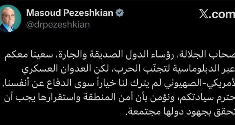 پزشکيان دا څرګندونې په خپل ایکس حساب کې خپرې کړې او د «دوستو او ګاونډيو هېوادونو مشرانو» ته په خطاب کې يې زياته کړې چې ايران لا هم د سيمې د هېوادونو حاکميت ته درناوی لري.