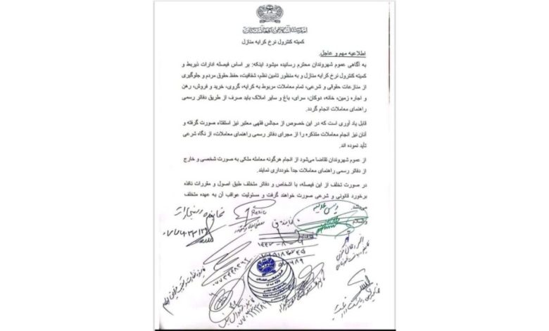 د آمو د راپور له مخې، د دې دستور پر بنسټ د کورونو، دوکانونو، سرايو، باغونو او نورو ملکيتونو پېر او پلور، کرايه او ګروي کول يوازې د رسمي رهنمايو د دفترونو له لارې جواز لري، او دغه دفترونه مکلف دي چې د معاملاتو جزئيات له طالبانو د ادارې له امنيتي بنسټونو سره شريک کړي.