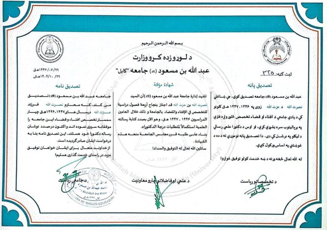 یک تصدیقنامه که از این نهاد به دست آمده نشان میدهد یکی از شاگردان، پس از ختم چهار سمستر در بخش افتاء و قضاء، وارد مرحله نگارش رساله دکترا شده است؛ موضوعی که پرسشهای جدی درباره سطح، مدت و اعتبار این دورهها ایجاد میکند.