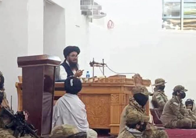 مولوی دینمحمد، رئیس شورای علمای اداره طالبان در کابل، هنگام سخنرانی در یک مسجد با حلقهای از محافظان مسلح دیده شد؛ محافظانی که سلاحهای ساخت ایالات متحده را حمل میکردند و این تجهیزات از دوره حکومت پیشین در افغانستان باقی مانده است.