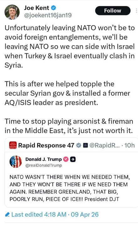 به گزارش خبرگزاری مهر، «جو کنت» در صفحه شخصیاش در شبکه اجتماعی ایکس نوشت که خروج احتمالی آمریکا از ناتو به هدف جلوگیری از درگیریهای خارجی نخواهد بود، بلکه به باور او، چنین اقدامی میتواند زمینه را برای ایستادن واشنگتن در کنار اسرائیل در صورت درگیری احتمالی میان ترکیه و اسرائیل در سوریه فراهم سازد.