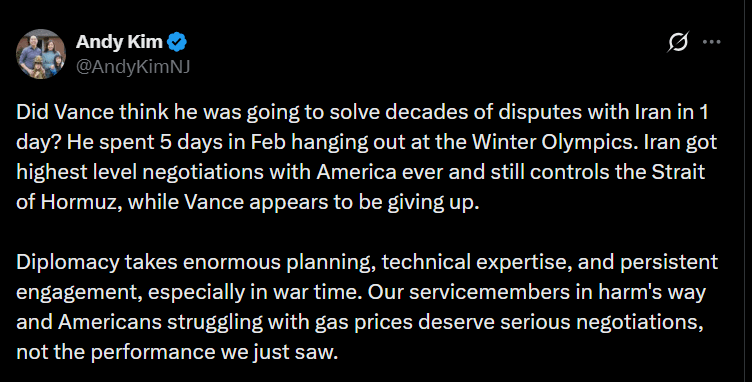 در پی پایان دور تازه مذاکرات میان هیئتهای ایرانی و آمریکایی در اسلامآباد، اندی کیم سناتور دموکرات ایالت نیوجرسی اعلام کرد که ایالات متحده در این گفتوگوها به نتیجه ملموسی دست نیافته است. او با انتقاد از عملکرد جیدی ونس، فرستاده ویژه دولت آمریکا، گفت واشنگتن عملاً در برابر ایران «کوتاه آمده و عقبنشینی کرده است».